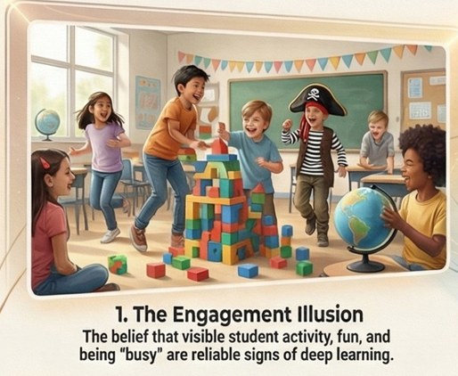 Το πρόβλημα ενισχύεται από μια βασική γνωστική προκατάληψη: έχουμε την τάση να συγχέουμε την επιφάνεια με την ουσία. Όπως σε μια παράσταση ταχυδακτυλουργού, αυτό που βλέπουμε μας πείθει, ακόμη κι αν η πραγματική διαδικασία παραμένει κρυφή. Στην εκπαίδευση, η «ορατή εμπλοκή» λειτουργεί ως ψευδο-δείκτης μάθησης. Εκπαιδευτικοί, γονείς και αξιολογητές επιβραβεύουν αυτό που φαίνεται, δημιουργώντας έναν αυτοενισχυόμενο κύκλο που ευνοεί πρακτικές εντυπωσιακές αλλά όχι απαραίτητα αποτελεσματικές.